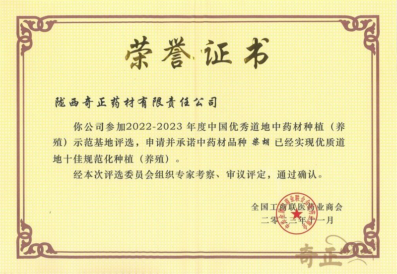 柴胡十佳基地證書(shū)