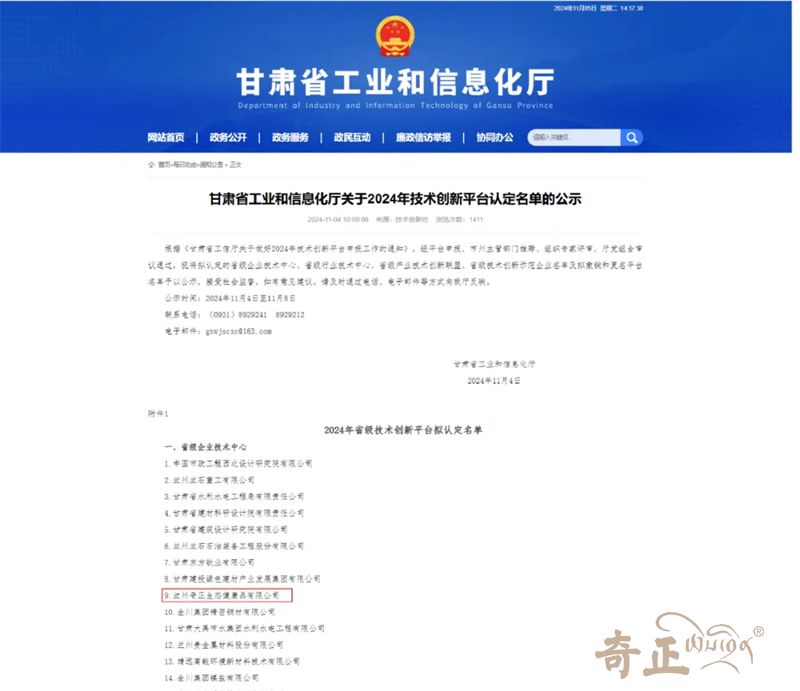 近日,甘肅省工業(yè)和信息化廳公示了2024年技術(shù)創(chuàng)新平臺(tái)認(rèn)定名單,全省33家企業(yè)被認(rèn)定為省級企業(yè)技術(shù)中心,蘭州奇正生態(tài)健康品有限公司榜上有名,成功躋身省級企業(yè)技術(shù)中心名錄。