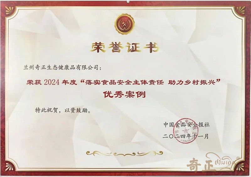 2024年11月3日,第十一屆全國食品安全監(jiān)管信息工作交流大會暨全國食品產業(yè)高質量發(fā)展(甘肅)大會在蘭州舉行。奇正健康榮獲2024年度“落實食品安全主體責任 助力鄉(xiāng)村振興”優(yōu)秀案例。