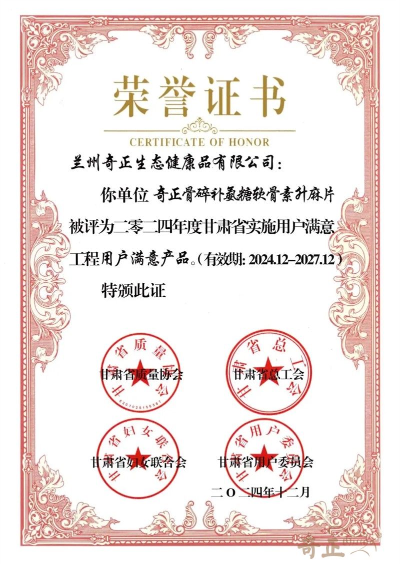 2024年12月,甘肅省質量協(xié)會、甘肅省總工會、甘肅省婦女聯(lián)合會及甘肅省用戶委員會聯(lián)合發(fā)布《2024年度甘肅省實施用戶滿意工程先進單位及個人的通知》。奇正健康旗下明星產品“奇正?骨碎補氨糖軟骨素升麻片”一舉摘得“用戶滿意產品”榮譽稱號。這是繼“奇正?紅景天當歸人參果百合膠囊”后,奇正健康保健食品再次獲得此項殊榮。該榮譽的獲得也是對公司產品和服務的高度認可和肯定。